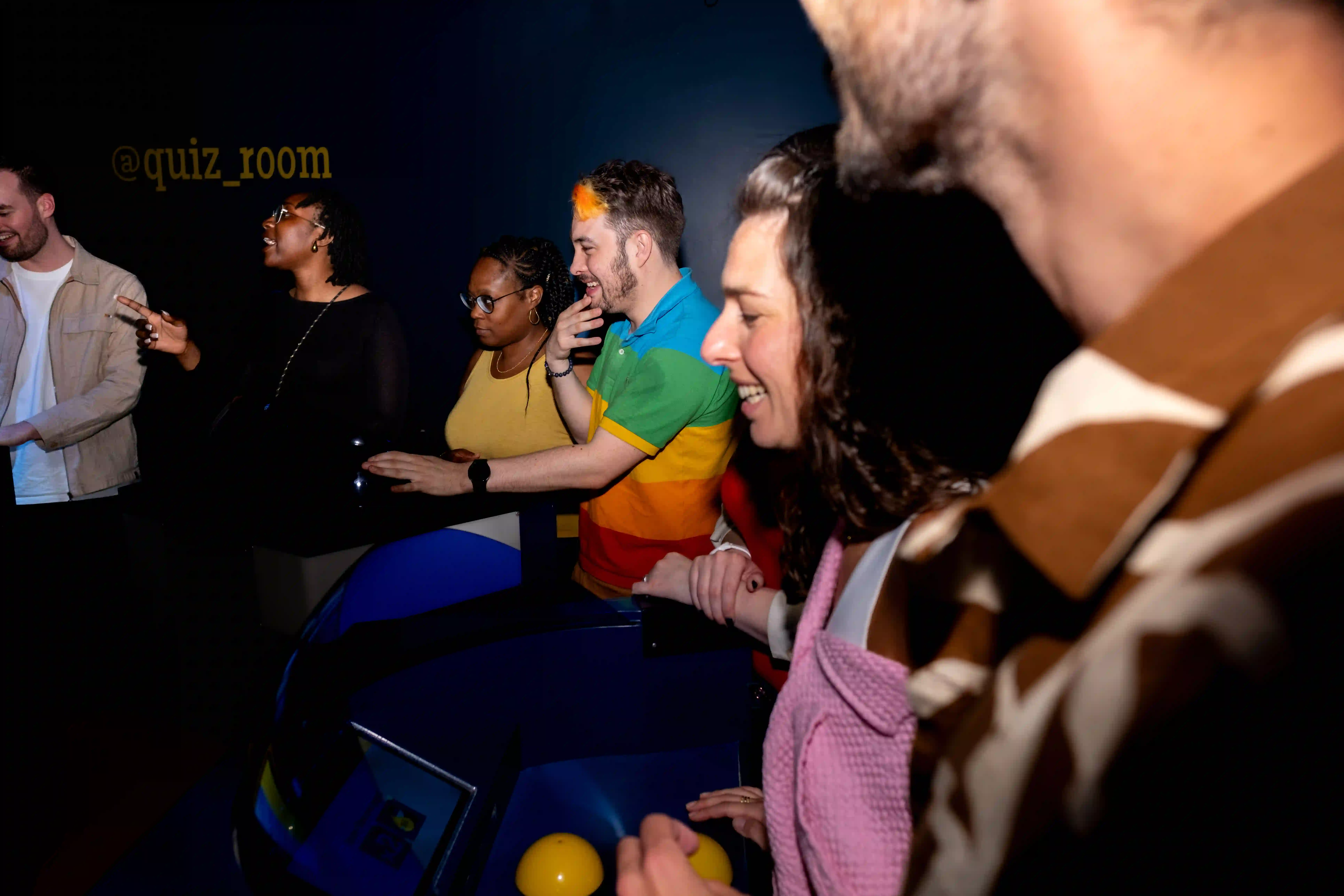 ![Salle immersive Quiz Room avec buzzers colorés et écrans lumineux]